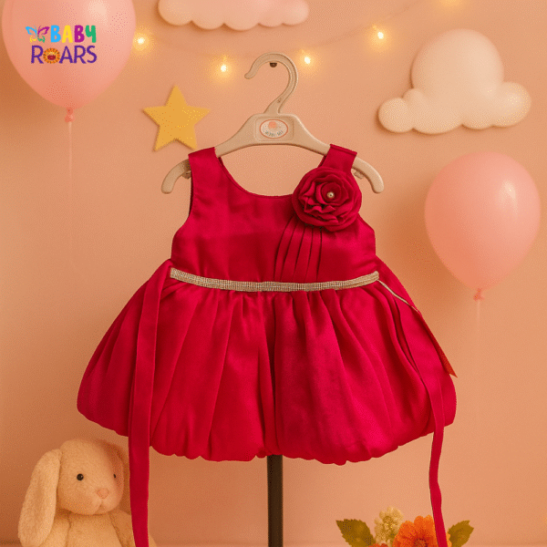 Dazzling satin party frock for baby girls with floral shoulder brooch, rhinestone waistband, and bubble hem – designed to shine!