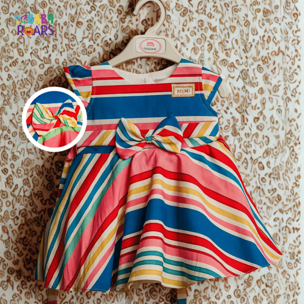 A bright and cheerful multicolor dress with bold stripes, mini label, and a matching waist bow – made for twirls, fun, and smiles.